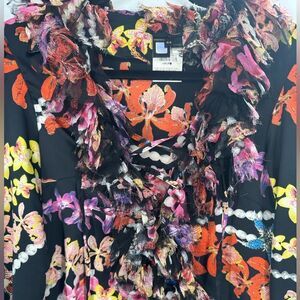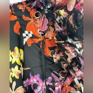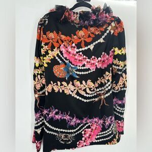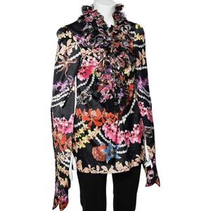 Robert Cavalli Just Cavalli Black Floral Printed Sateen Ruffled Neck Detail Top. Size is 44 which is a US 8. Check measurements, sleeves are long. The ruffles are intentionally not fully attached to the neckline so they can droop! Great condition. No flaws!