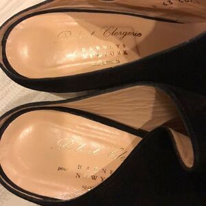 Robert Clergerie Barney’s New York Black Suede wedge peep toe sandals. Never worn. A few scratches on wooden platform. Size 10. Comes with original box and dust bag. 4” heel and 1” platform in front approx. JL.