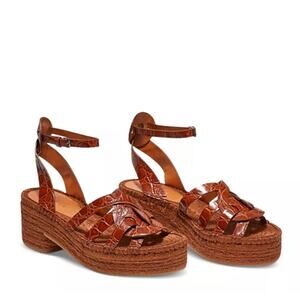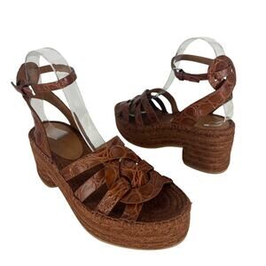 Robert Clergerie Brown Chaya Croc Embossed Leather and Raffia Heels.