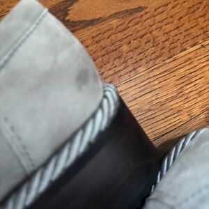 The Robert Clergerie Ladies Suede tassel Platform Loafers in size 38.5 (measures 10.75 sole)are stylish and comfortable women's shoes. These gray loafers feature tasseled accents and a platform heel, making them a fashionable choice for any outfit. Made of suede with a leather insole, these shoes offer a touch of luxury and sophistication to your wardrobe. The rubber outsole provides durability and support, while the M width ensures a comfortable fit for size 8.5 US shoe sizes. Perfect for adding a chic and trendy touch to your look.