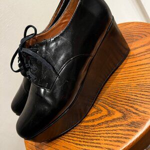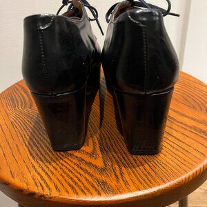 These shoes feature a black glossed leather oxford design with a lace-up front, an almond toe, and a wedge heel with a platform. The heel height is 2.5 inches, with a 1-inch platform at the front.