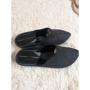 Clergerie Paris black felt mules with a pointed toe design and platform sole. Features Robert Clergerie branding on the insoles. Comfortable slip-on style with high-quality craftsmanship.
