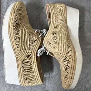 Color: Natural tan upper with white wedge/platform sole; white laces