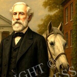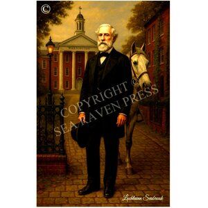 Celebrate one of the South’s most iconic figures with this elegant full-color poster featuring Confederate General Robert E. Lee and his legendary warhorse, Traveller—captured in a majestic, dignified scene inspired by the timeless style of a 19th-century oil painting.