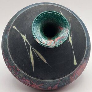 Robert Ellert Signed Raku Pottery Vase Iridescent Red Green Blue Black 6.5" H