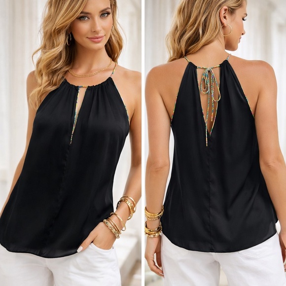 The back showcases a dramatic open keyhole design with adjustable tie closure, creating a flattering and feminine look from every angle.