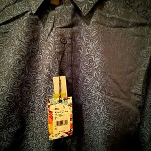 Stylish gray shirt with intricate swirl design. Perfect for casual outings. Comfortable and chic.