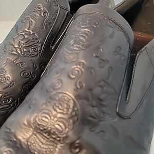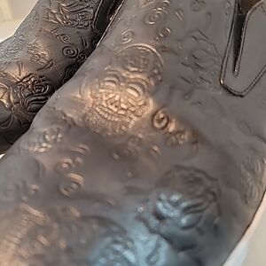 Elevate your casual look with these Robert Graham Baxter slip-on shoes. The black leather upper, adorned with a striking paisley pattern, is complemented by a round toe and slip-on closure for easy wear. The shoes feature a comfortable leather insole and outsole, making them perfect for all-day wear. Ideal for travel, workwear, or casual occasions, these shoes are a versatile addition to any wardrobe. The grunge, bohemian, skull, 90s, and gothic themes make them a unique and stylish choice. Available in US shoe size 15W, these Robert Graham slip-on shoes are a must-have for any fashion-forward man.