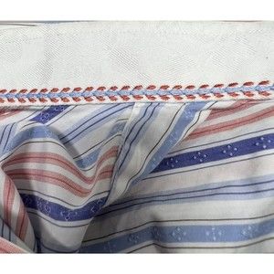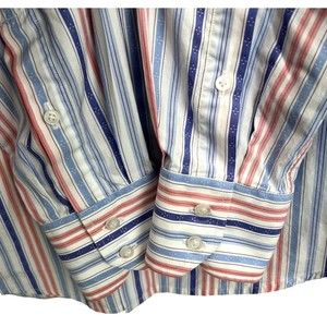 Robert Graham Blue, Purple, and pink Striped Button Up Shirt with Embroidered Flip Cuffs SZ 39/15.5 100% cotton, point collar. Actual Measurements (laid flat to measure): Chest (armpit-armpit): 21.5, Shoulder to shoulder: 18, Sleeves (top of collar-cuff): 34, Length (back): 32 Good condition overall. Please note: *there is a small frayed spot on the collar, right wear it folds. single snap at the bottom won't snap. no problem if tucked in. very light discoloring on inside collar**