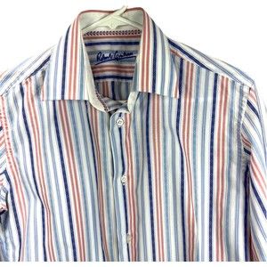 Robert Graham Blue Purple Striped Button Up Shirt Embroidered Cuffs Sz 39/15.5