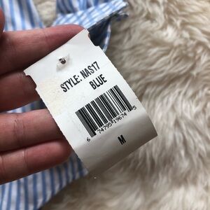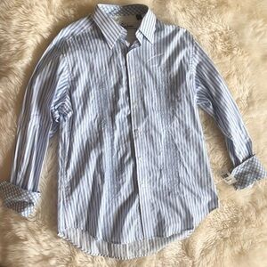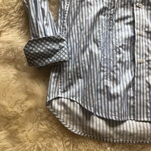 Blue and white stripes. Front embroidery. Button down. Two extra buttons. Cotton. Long sleeve with plaid detail at inner cuff.