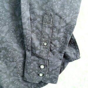 US Size S, classic fit Color: black base, jacquard floral Neckline: collared Closure: front button Sleeves: long, button cuff, logo embroidery, flip cuff designs Hem: rounded Extra buttons on the material tag No stains, no tears, in excellent condition