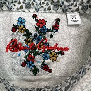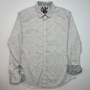Robert Graham Button Front Shirt with Contrasting Cuffs. Cotton/spandex blend. Pale grey and white print. Mens size XL Extra Large. Good used condition.
