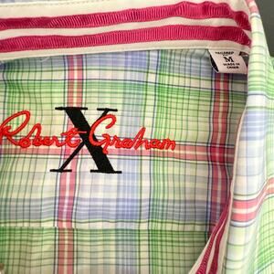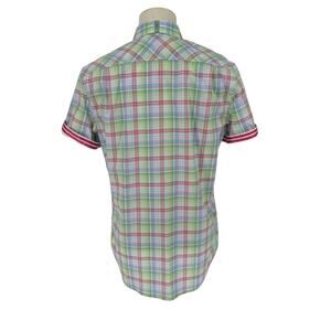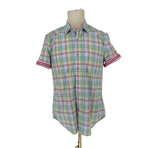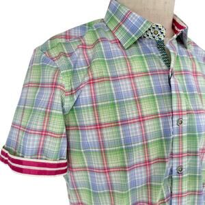 Robert Graham Casual Button Front Short Sleeve Shirt RONAN Spring Glen Check Pink Green White M