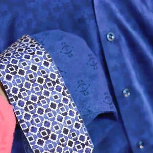 Elevate your wardrobe with this Robert Graham button-down shirt in size XL. The striking abstract geometric pattern in blue is accented with embroidered buttons and contrasting trim for a designer touch. The classic fit and button-down collar make it suitable for any occasion, from travel to weddings and parties, as well as business and formal settings.