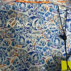 Robert Graham Del Sol Shirt. Multi colored print button up with frosted white logo buttons, short sleeve polyester spandex soft, slightly curved hem, UV protection. New with tags. Very handsome shirt. Size 4XL. Flat lay measurements are: shoulder to hem is 30" and pit to pit is 29".