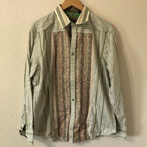 Robert Graham Embroidered Floral Striped Casual Button Down Shirt Green Large