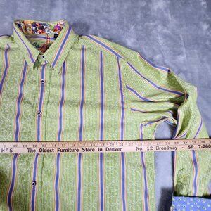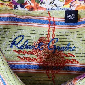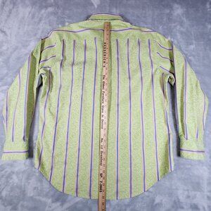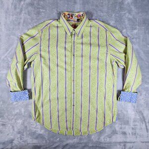 This Robert Graham button-up shirt combines vibrant green stripes with contrasting cuffs and a whimisical inner collar detail. Crafted in India, it provides a unique and sophisticated aesthetic suitable for professional or casual settings. Its XL size ensures a comfortable fit while maintaining stylish appeal.
