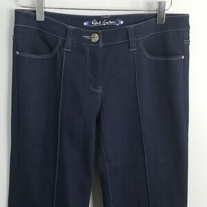 Robert Graham dark blue flared leg jeans, size 4. Seamed down the center of the legs, on the front side. 4 pockets. Waist 29.5", Rise 8", Inseam 34", Leg opening 10" across. cotton, polyester, elastane. stretch. No flaws. Smoke free.
