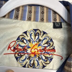 For sale in excellent preowned condition is this Robert Graham Flip Cuff Button Down Men’s XL Stripe Blue Gray Pattern Cotton