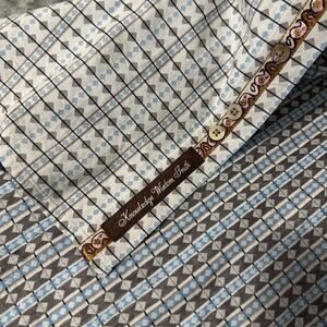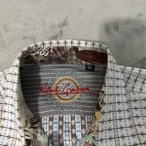 This Robert Graham shirt for men in size L features a colorful striped pattern with button-down collar and long sleeves. Made of breathable cotton, it is suitable for various occasions like travel, parties, work, and more. The shirt has button accents and an embroidered design, with a regular fit perfect for all seasons.