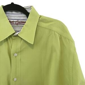 This shirt features the brand's signature bold styling, with a rich Green base contrasted by a complex patterned stripe design. It includes the highly sought-after Flip Cuff (or Contrast Cuff) lining, which is visible when the sleeves are rolled. Made from breathable 100% Cotton, this is a unique statement piece for business casual, date night, or collector wear. Measurements are key for Robert Graham shirts; please review the included dimensions for a perfect fit.