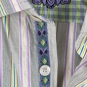 Stripes in green, purple and grey with foulard contrast inside cuffs, contrast check fabric inside back yoke and even more contrast in a ribbon stripe down the buttoned side. Cotton, machine wash.