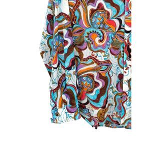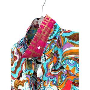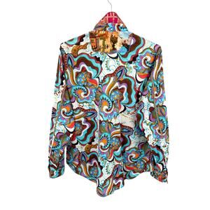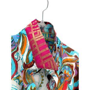 The Robert Graham Limited Edition Shirt in Men's XL is a psychedelic-patterned button-up shirt made of lightweight cotton knit fabric. This casual shirt features a collared neckline, long sleeves, and embroidery with the brand logo. With a point collar style and regular fit, it is perfect for all seasons and occasions. The shirt is a designer piece from the Robert Graham product line, adding a unique touch to any wardrobe with its multicolor design.