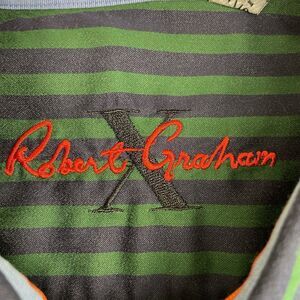 The Robert Graham Long Sleeve Striped Button Down collared Shirt in Green-XL is a stylish and versatile addition to any man's wardrobe. Made from comfortable cotton with a knit fabric type, this shirt is perfect for both parties and casual occasions. Featuring a classic striped pattern, button closure, and a button-down collar, this shirt exudes a designer and colorful theme. With a regular fit and a chest size of 48 inches, this shirt is a timeless piece that can be worn year-round. Designed by the renowned brand Robert Graham, this shirt is a must-have for the modern gentleman.