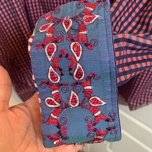 Beautiful orange and navy button-down with intricate embroidery on cuffs. Approximately 25 inches pit to pit.