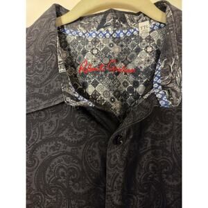 In excellent clean condition. This Robert Graham men's shirt in size 2XL features a stylish black paisley design, short sleeves, and a classic button-up closure. Made from lightweight and breathable cotton fabric, this shirt is perfect for all seasons and is easy to care for with machine washable instructions. The collared neckline and button-down collar style add a touch of designer sophistication to this casual yet classic piece of clothing. Ideal for men looking for a versatile and comfortable option for any occasion.