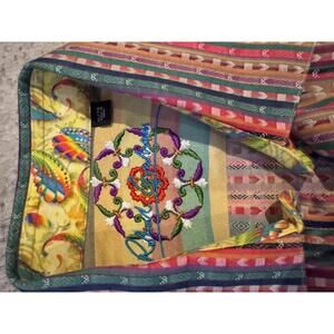 Features a colorful striped pattern with intricate embroidery inside the collar.