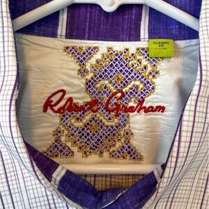 This Robert Graham dress shirt offers a sophisticated look with its purple pattern and classic fit. Made from 100% cotton, it ensures comfort and style for professional settings.