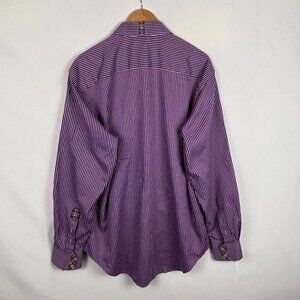 This Robert Graham shirt in size XL features a sophisticated purple-striped design. Crafted from 100% cotton, it offers both style and comfort, making it a versatile addition to a professional wardrobe. The vibtant colors and contrasting cuffs will make a statement at any party or gathering.
