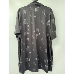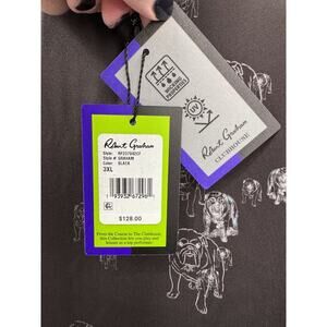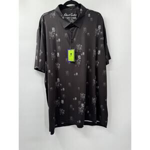 This is a Robert Graham polo shirt for men in size 3XL. The shirt features a black color with a bauble dog print design on a solid fabric. It has a collared neckline with a button closure, short sleeves, and a spread collar. The shirt is machine washable and offers easy care and breathability, making it suitable for activewear or casual occasions in the summer and spring seasons..