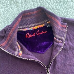 Experience the luxurious feel of this Robert Graham sweater, crafted in a rich purple hue. The zip-up design and stand-up collar offer both style and functionality, while the smooth knit material ensures a comfortable, relaxed fit. Perfect for layering, this sweater is a versatile addition to any wardrobe. Has some pilling and 2 small holes. Please see photos for details.