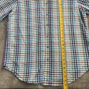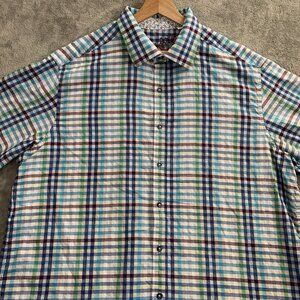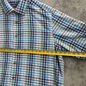 The Robert Graham Shirt for men in size XLT (Extra Large Tall) features a classic plaid check pattern, short sleeves, and a collared neckline with a button closure. Made from quality cotton fabric, this button-up shirt is perfect for casual occasions, such as travel, parties, or everyday wear.