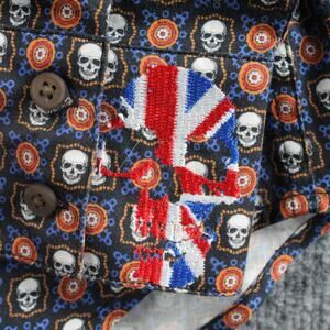 Embellishments: Union Jack skull embroidery at cuff and back-collar tab; "Knowledge Wisdom Truth" embroidery on inner placket; signature Robert Graham script and rose embroidery inside collar; RG monogram detail