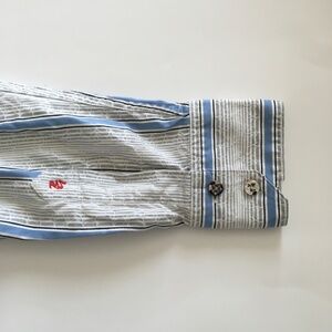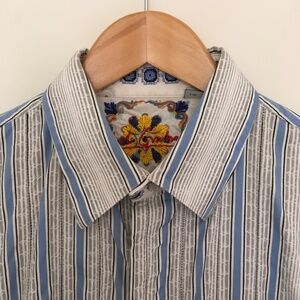 Robert Graham Shirt Mens L Flip Cuff White Blue Striped Contrast Abstract Logo