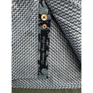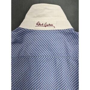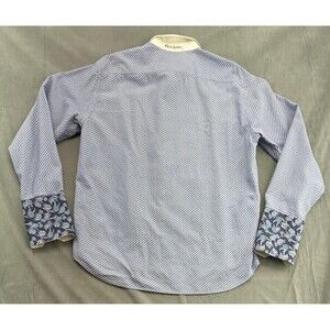 Robert Graham Shirt Men's Large Blue White Geometric Flip Cuff Floral Cotton Dress. Condition: Fair used condition. Light wear, minor signs of use. Shows two small snags on fabric and marks inside cuffs as shown in photos. Collar has some staining/yellowing. 100% Cotton. Made in India. No size tag. Measurements equivalent to size Large. Measurements in photos. Smoke free home.