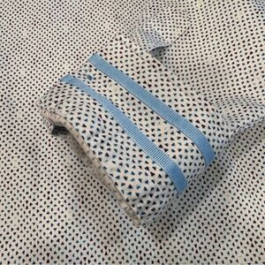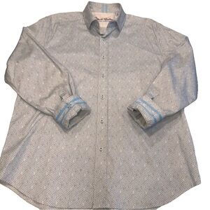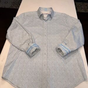 Excellent like new condition. Men’s River Graham bottom down long sleeve shirt. Blue & white tiny geometric print, flip cuffs with ribbon accents, size XL. See photos for measurements
