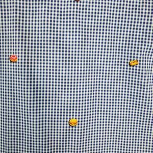 Features and description: shirt; button front; long sleeves; tailored fit; gingham check pattern; fast food print; burgers fries donuts hot dogs; blue and white