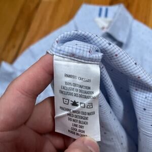 Tagged size small, tailor fit, cool dotted pattern over a grid with floral print accents on the sleeve flip and inside collar. Please note some discoloration to collar. See pictures for details and measurements. Orders ship out on Monday, Wednesday, and Friday.