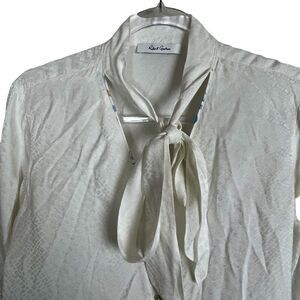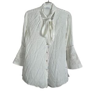 Robert Graham Silk Bamboo Ivory Button Up Bell Sleeve Embroidered Women's Size S Blouse Neck Tie