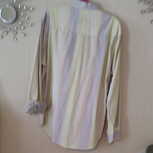 SALE TODAY! ECU. Eyes are on YOU with this button up shirt by Robert Graham with unique stripe pattern and background of yellow, blue, and gray tones. Paisley decorated cuffs. Size XL. 24" pit to pit flat. Curved hem. A beautiful shirt for day or night. Work or play.