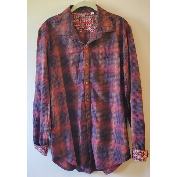 Like new condition. Clean. Elevate your autumn wardrobe with this Robert Graham tailored fit button-down shirt. The shirt features a plaid pattern with embroidered accents, a classic fit, and a button-down collar style. It is made with woven cotton fabric that is machine washable and has a chest size of 46 inches.
