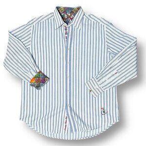 Robert Graham White Blue Striped Button Up Shirt Flip Cuff Embroidered Mens L