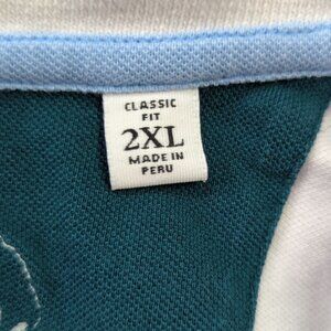 This Robert Graham Men's 2XL Polo in white with blue trim is perfect for a stylish and comfortable look. Made in Peru, it features a unique "Wisdom Knowledge Truth" embroidery, adding a touch of sophistication to your outfit.