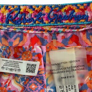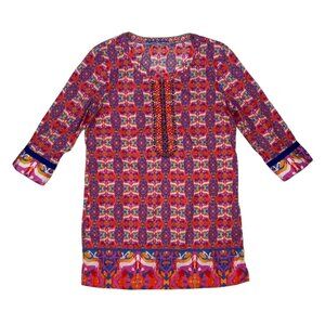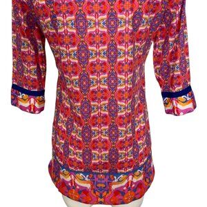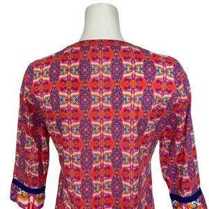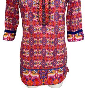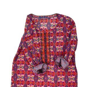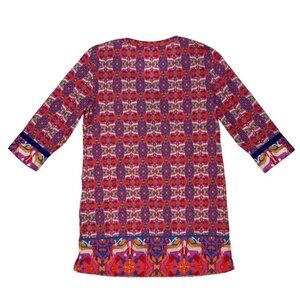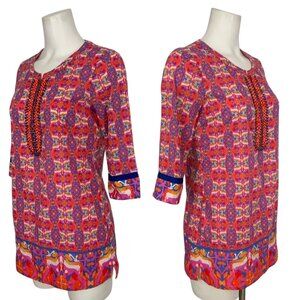 This Robert Graham women’s Meli Printed Woven Tunic Top Coverup makes a statement due to its 3/4 length sleeve, hook/eye Henley neckline, embellished beaded trim, blue cuff trim, tunic length with side slits, contrasting inner trim and pink design.