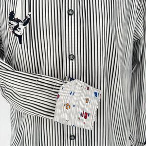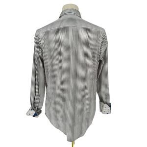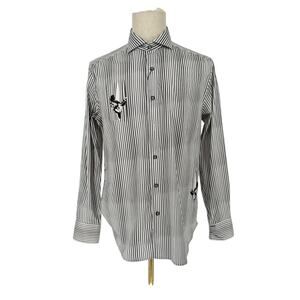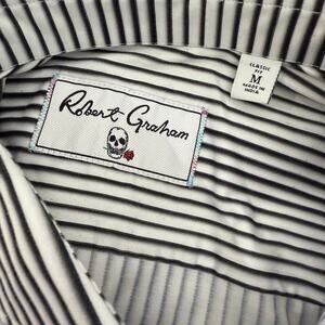 Robert Graham Woven Button Front Long Sleeve Shirt Rock Band Guitarist Print Classic Grey White Vertical Stripe M